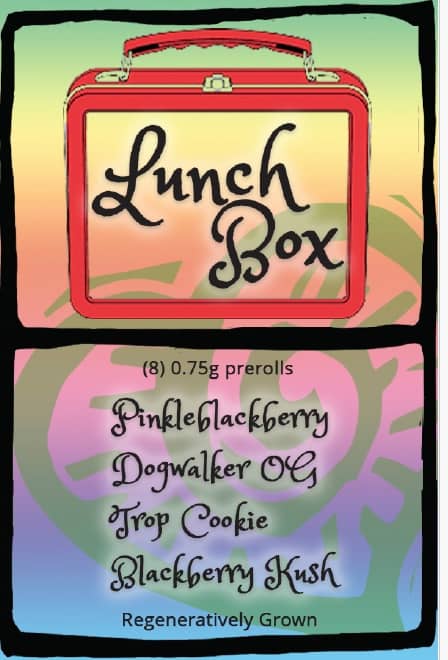 This month let's chat about the Lunch Box. This 7 pack of 0.75 gram prerolls showcases 4 of my favorite cultivars. First of all, Pinkleberry. This is the Pinkleberry spoken of during my lectures.😜 She's quite cosmic with absolutely zero myrcene ~ translate that to mean, not sleepy at all. The award winning Tropicana Cookies with her orangy happy goodness is lovely for enjoying almost anything. Blackberry Kush, my oldest friend of the pack is on the calmer, pain relieving end of the spectrum. Finally Dogwalker OG is a sedating gassy powerful punch.